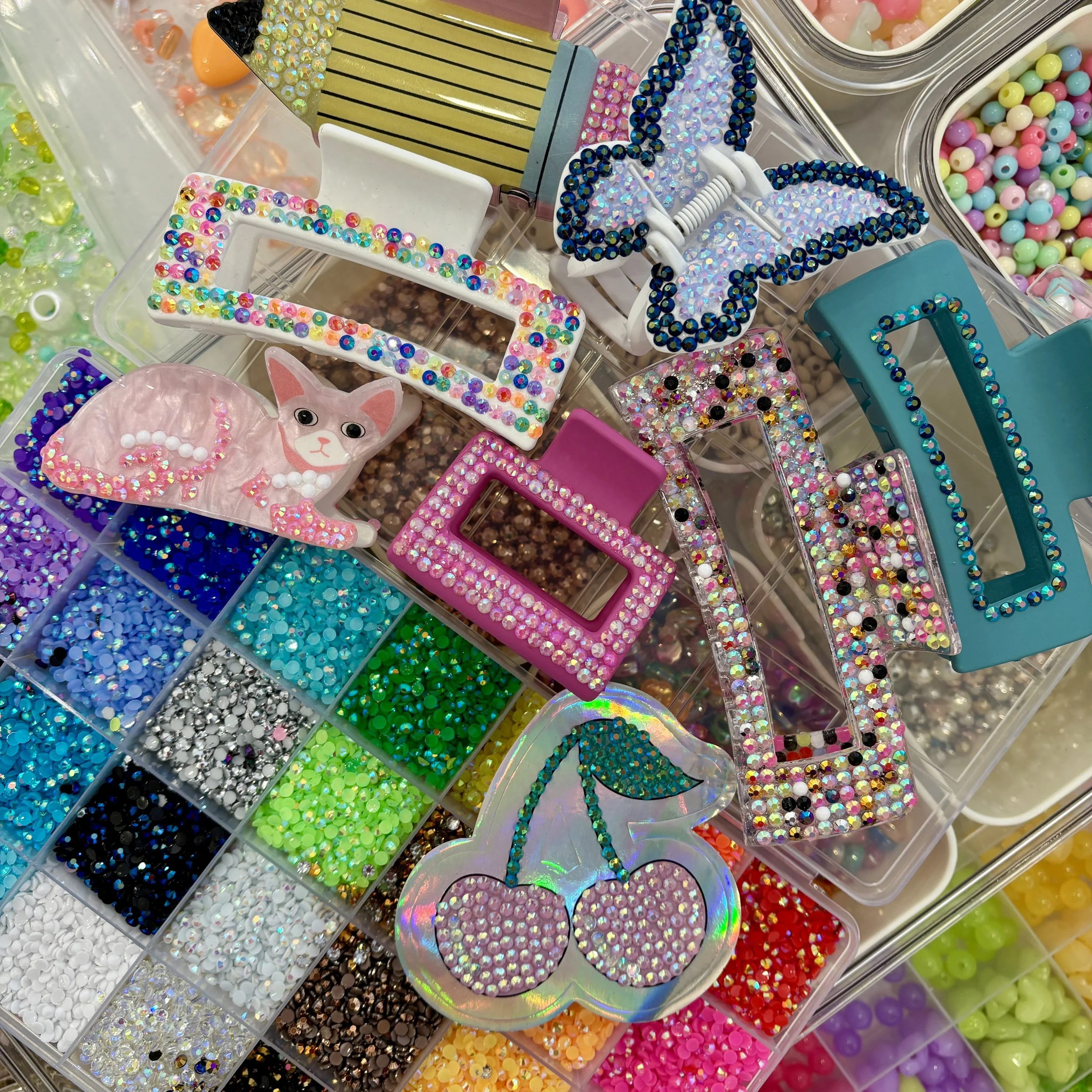 Two claw-style hair clips — we’ll have plain ones in plenty of colors plus some fun shaped clips to spark your creativity. Choose to just add gems to a small part, or cover the whole clip. We’ll have lots of samples.